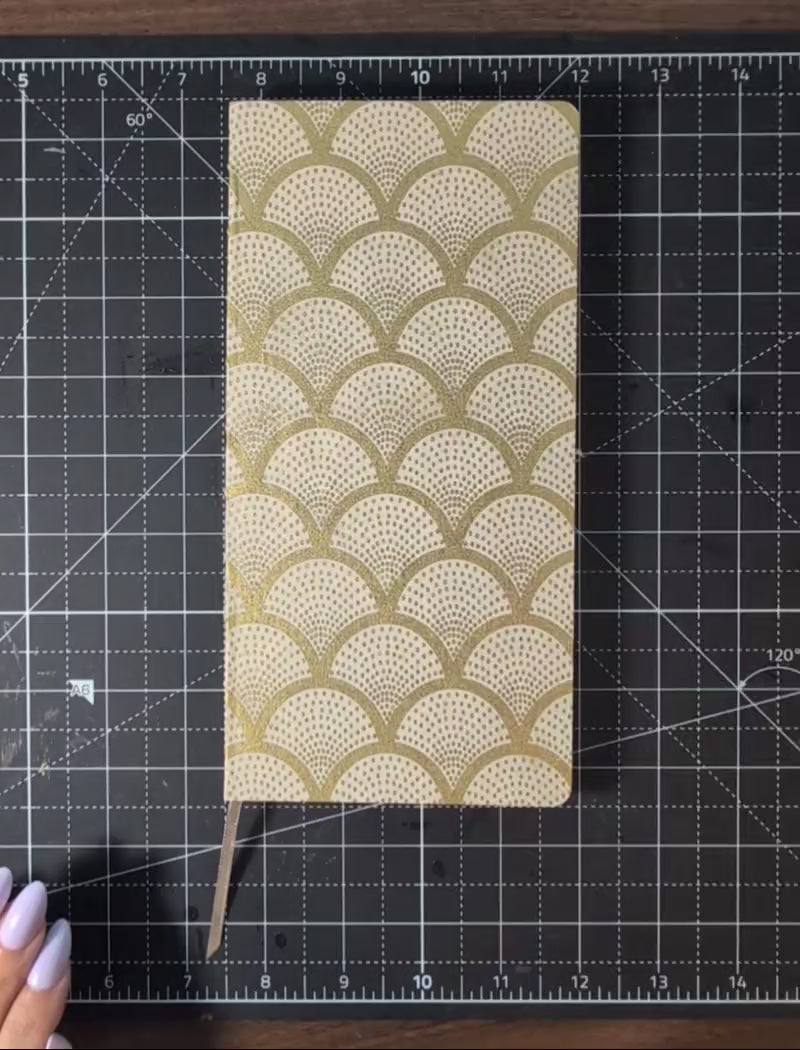 The cover is cream with a repeating gold scallop pattern — arcs of dotted gold stacked in rows, geometric and precise, with the warmth of something handmade underneath it. It reads differently in different light. In the morning it glows. In candlelight it deepens.